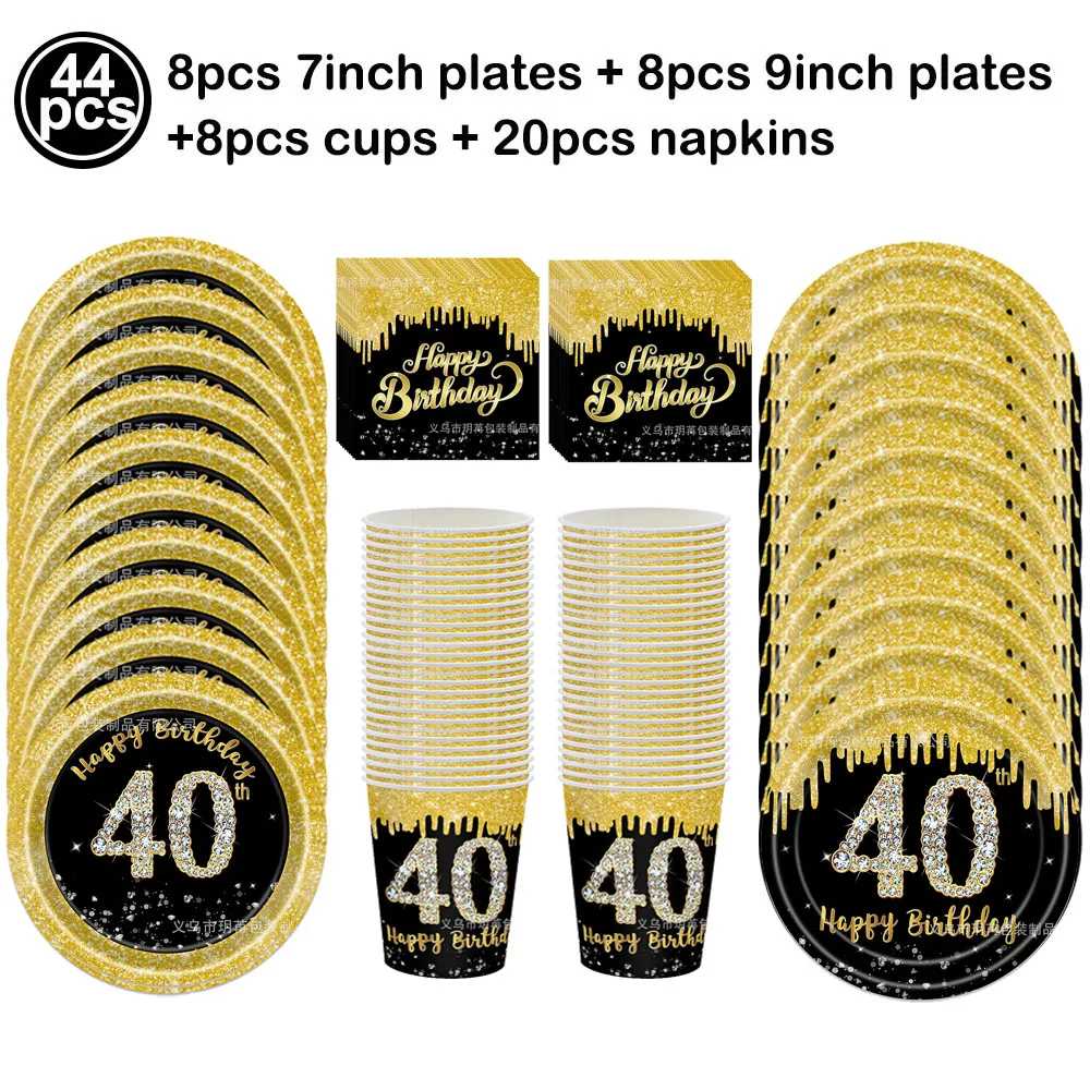 Kit de vaisselle anniversaire “40 Happy Birthday” noir et or – 44 pièces