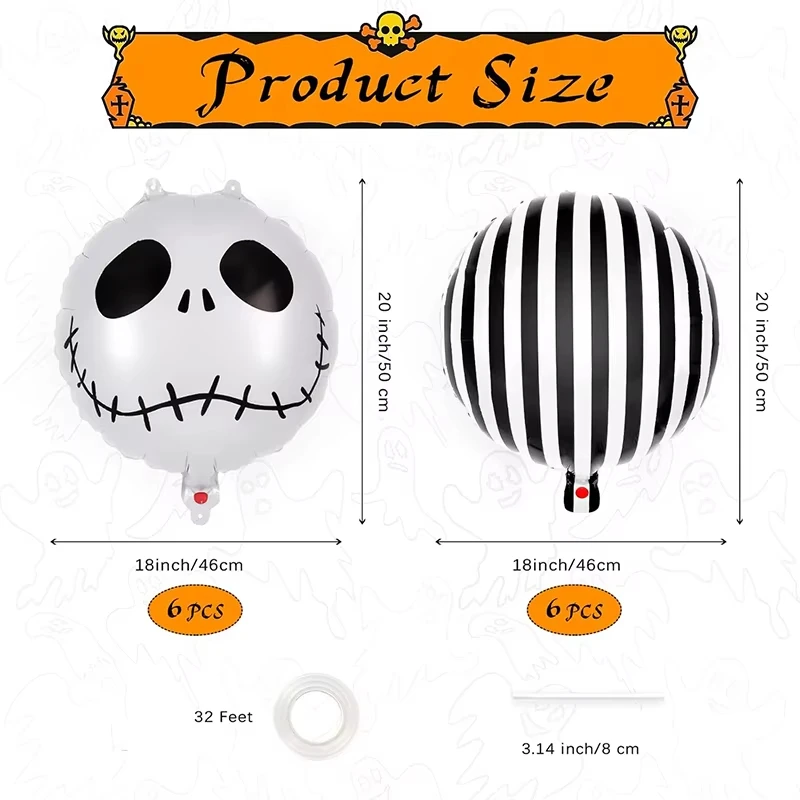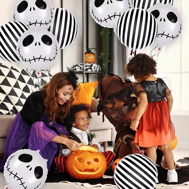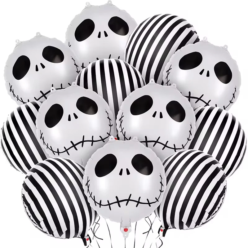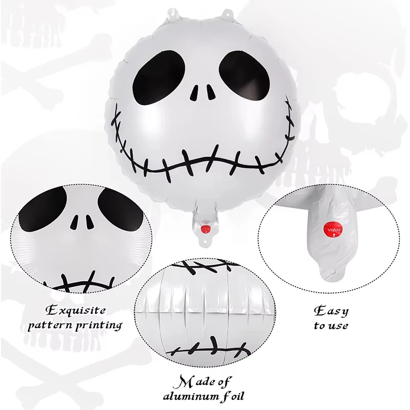 La collection inclut les personnages emblématiques du film : Jack Skellington, Sally, Zero le chien fantôme et Oogie Boogie. Chaque ballon présente une impression haute qualité qui respecte fidèlement l'esthétique de Tim Burton, avec des détails précis, des couleurs vibrantes contrastant avec des tons sombres, et les expressions caractéristiques des personnages. La surface métallique réfléchissante amplifie l'effet visuel en créant des jeux de lumière, garantissant que les designs restent nets et reconnaissables même de loin.
